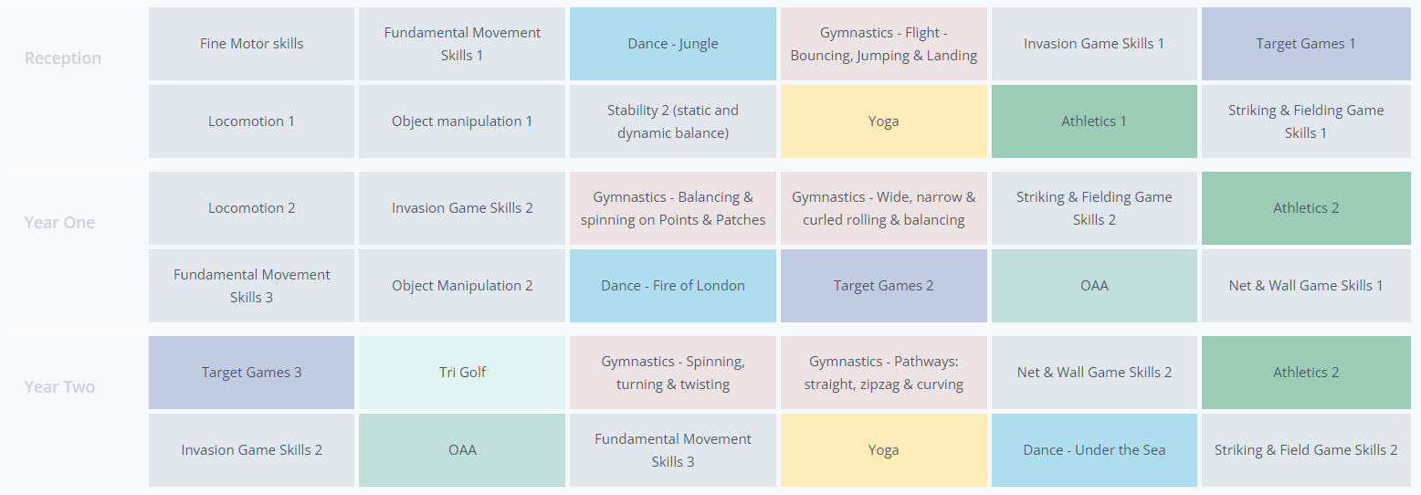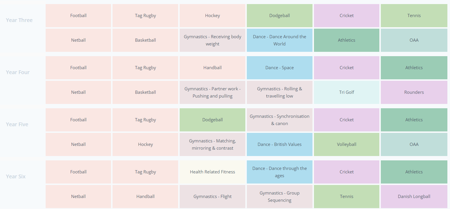 Our curriculum provides children with 2 hours of stimulating activity per week, which has an advantageous impact on their wellbeing. Children will learn about the impact and importance of healthy body, healthy mind. PE lessons will give children a platform and concrete understanding of how sport and exercise can, and should be sustained throughout their lives. Our impact is therefore to motivate children to employ these underpinning skills in an independent and effective way in order to live a happy and healthy life.